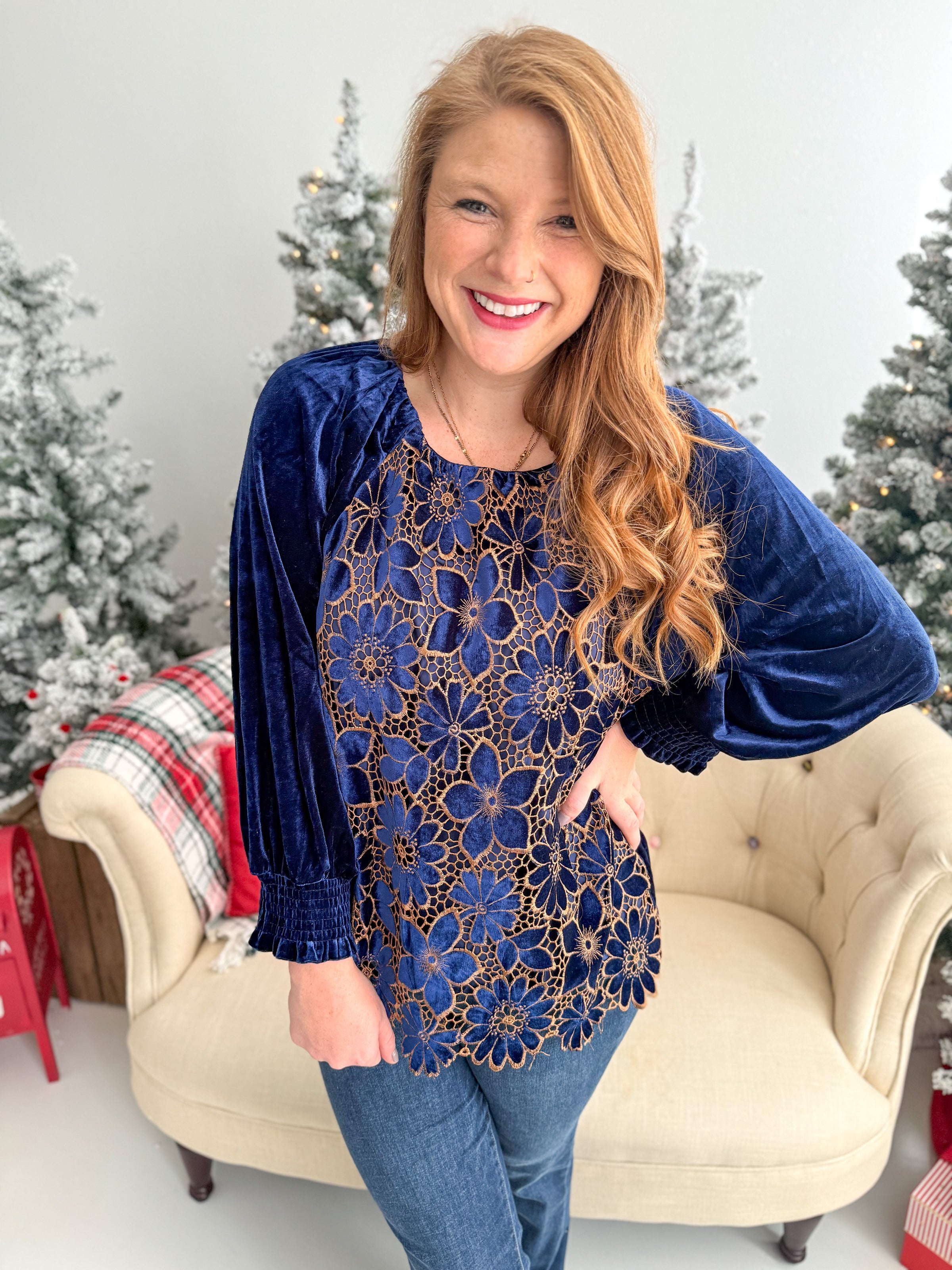 Navy Floral Velvet Top