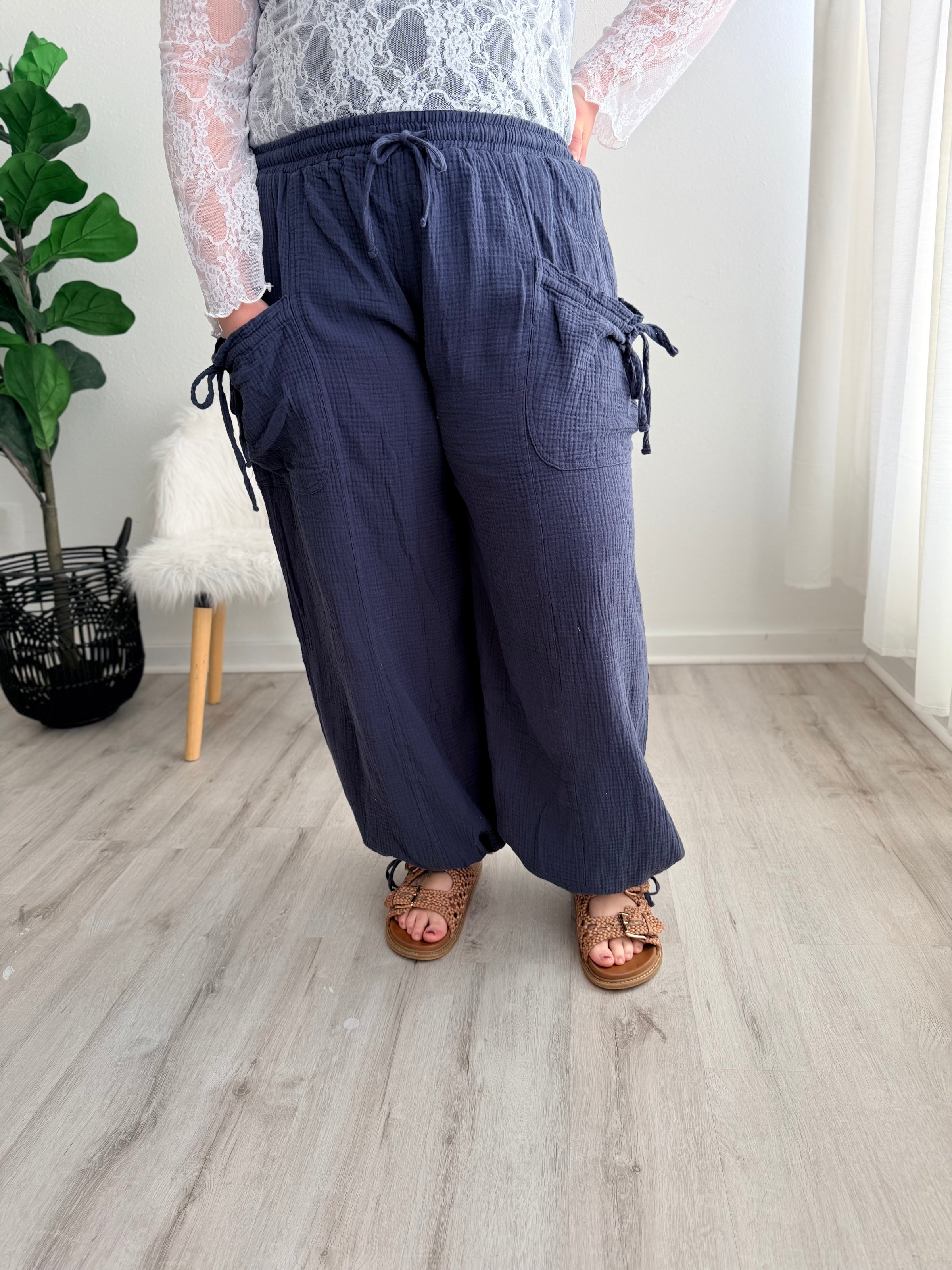 Slip into effortless spring style with these vintage-inspired gauze joggers. Designed with a relaxed, comfortable fit and functional pockets, they're lightweight enough for warm weather while maintaining that cozy vibe. True to size and perfectly paired with our mesh lace tops for an undeniably cute look. Your new go-to for laid-back days that still feel put-together.