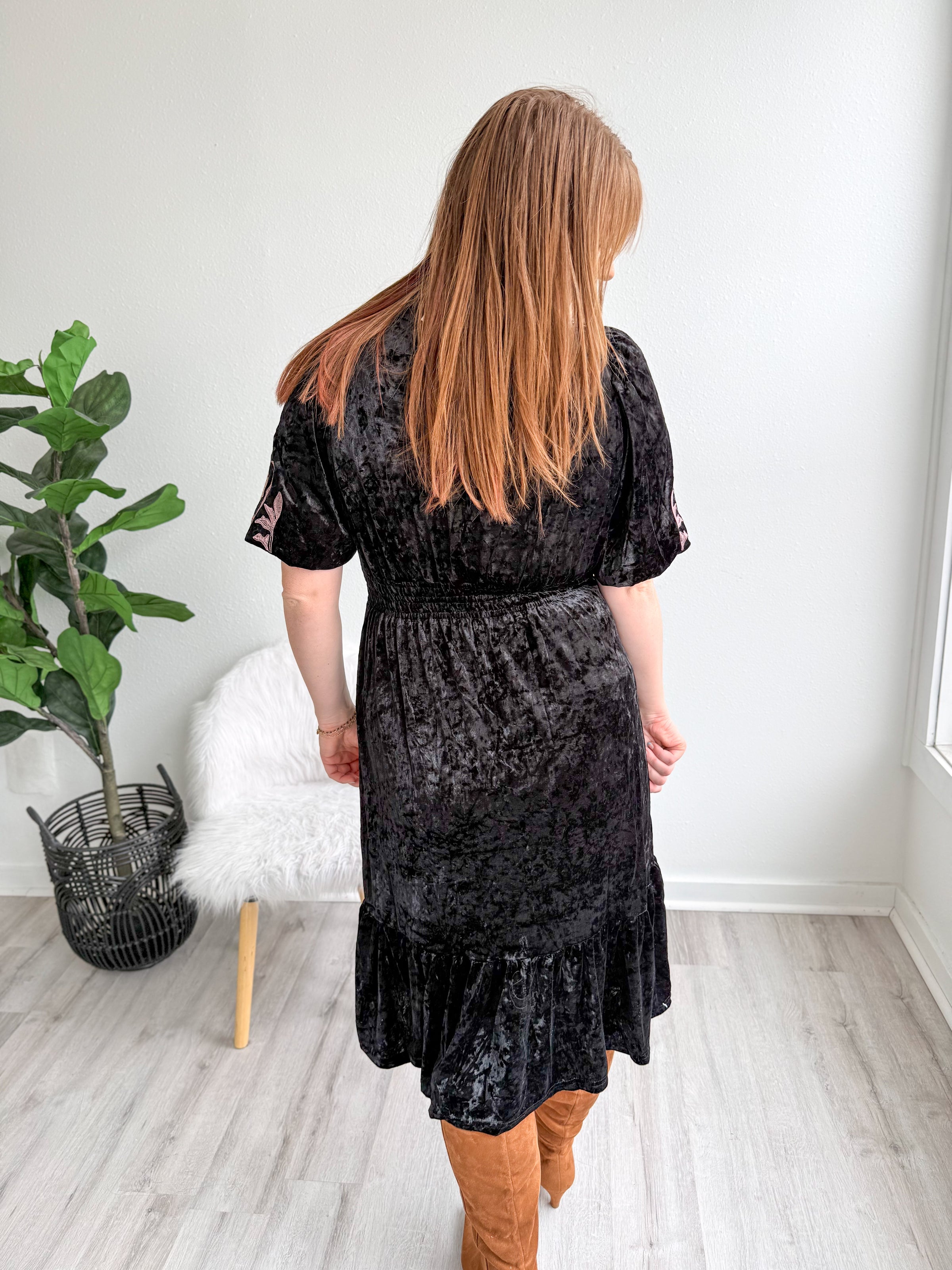 Slip into elegance with this stunning black velvet dress that's equal parts sophisticated and fun. Short sleeves frame delicate rose embroidery that adds a romantic touch to the classic silhouette. Perfect for date nights, special occasions, or whenever you want to feel absolutely fabulous. The soft velvet fabric drapes beautifully while the embroidered rose detail keeps things interesting—because who says timeless has to be boring?