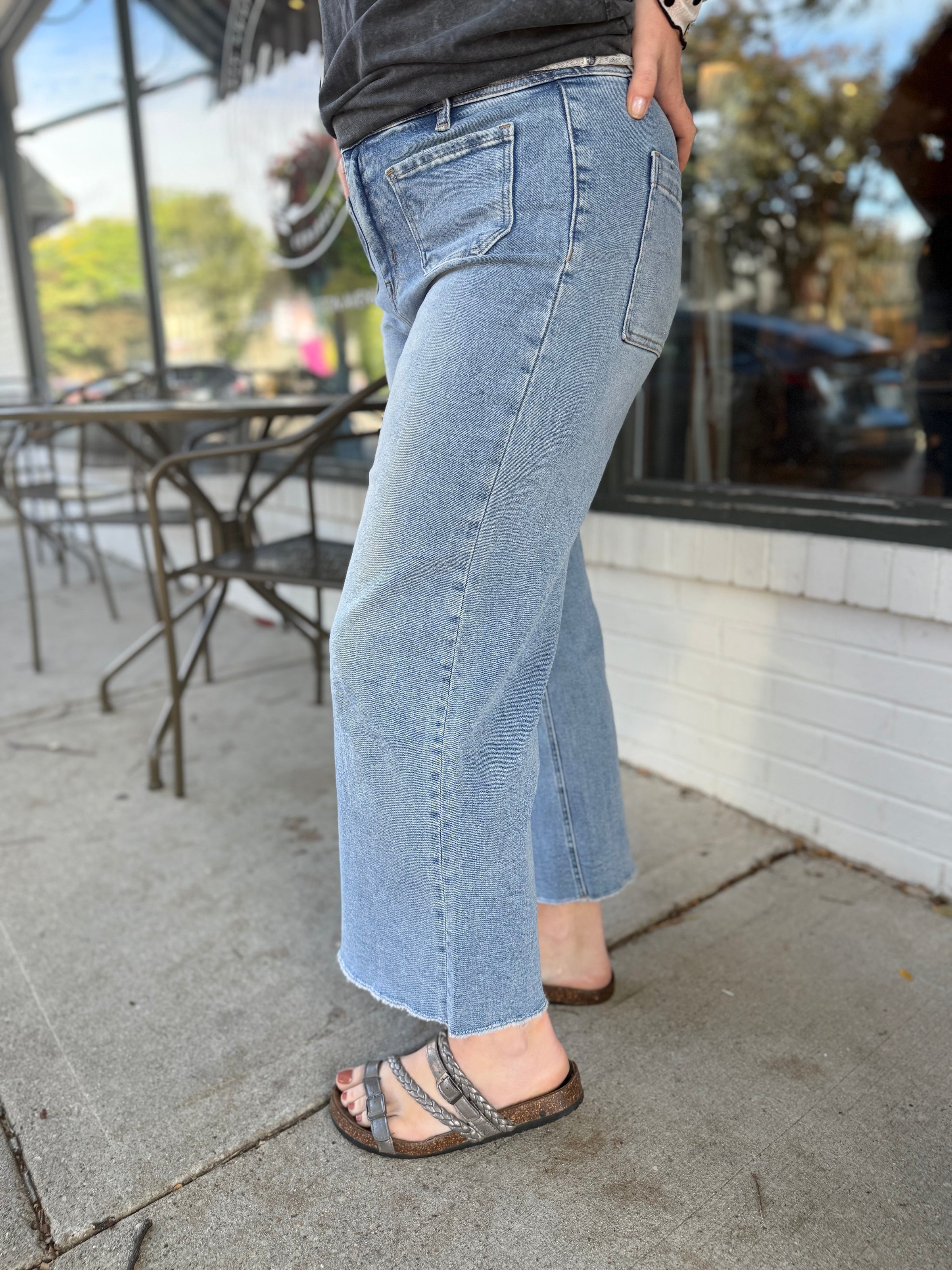 Step into comfort and style with the Delah Crop Wide Leg Denim. Featuring a playful cropped wide-leg cut, these jeans boast adorable front pocket details and a trendy frayed hem. Crafted with stretchy fabric, they offer comfy all-day wear, while the ultra high waist provides tummy control for a flattering fit. True to size, these denim pants effortlessly combine casual cool with a touch of sass. Perfect for showing off your vibe with ease!