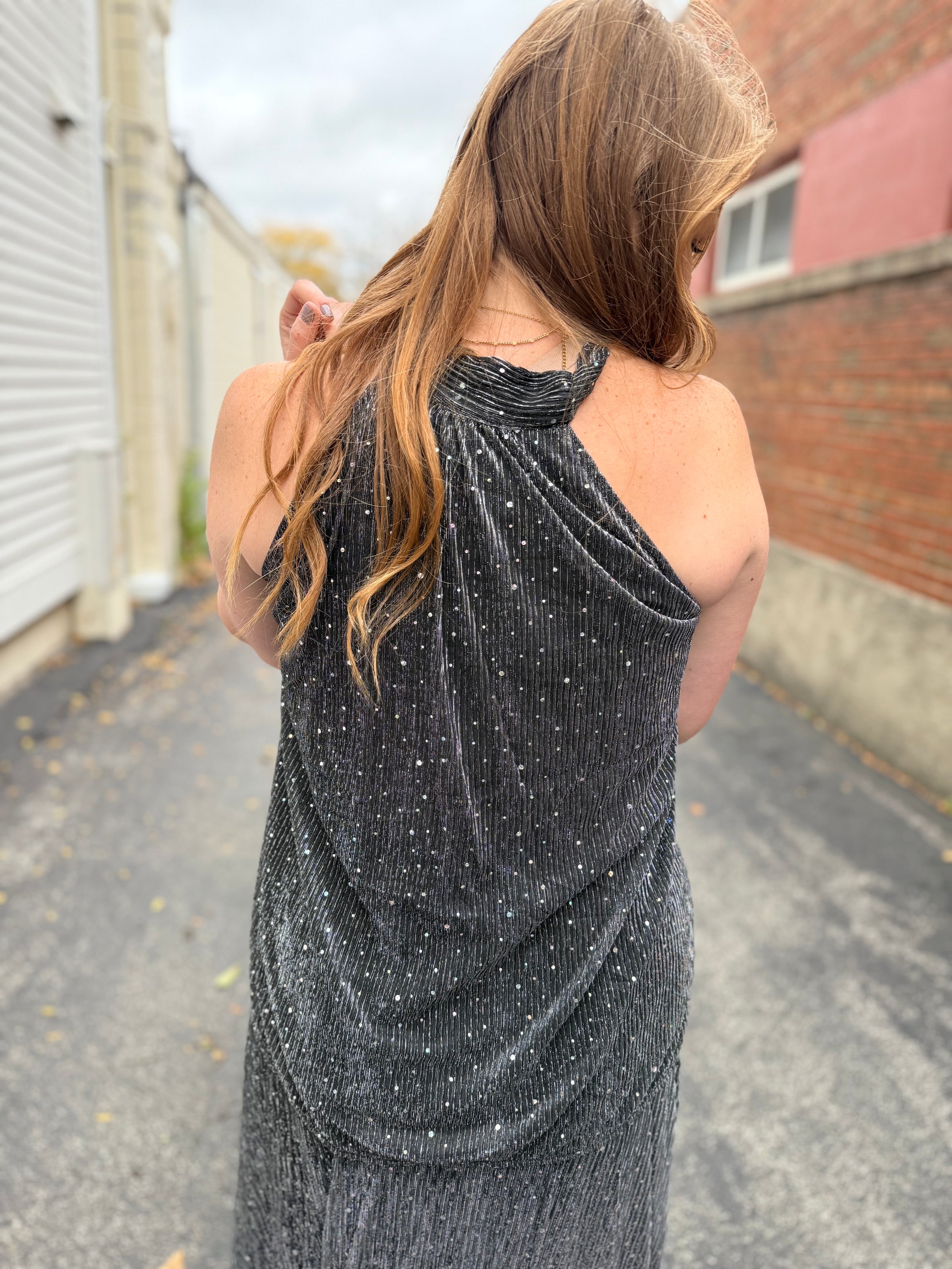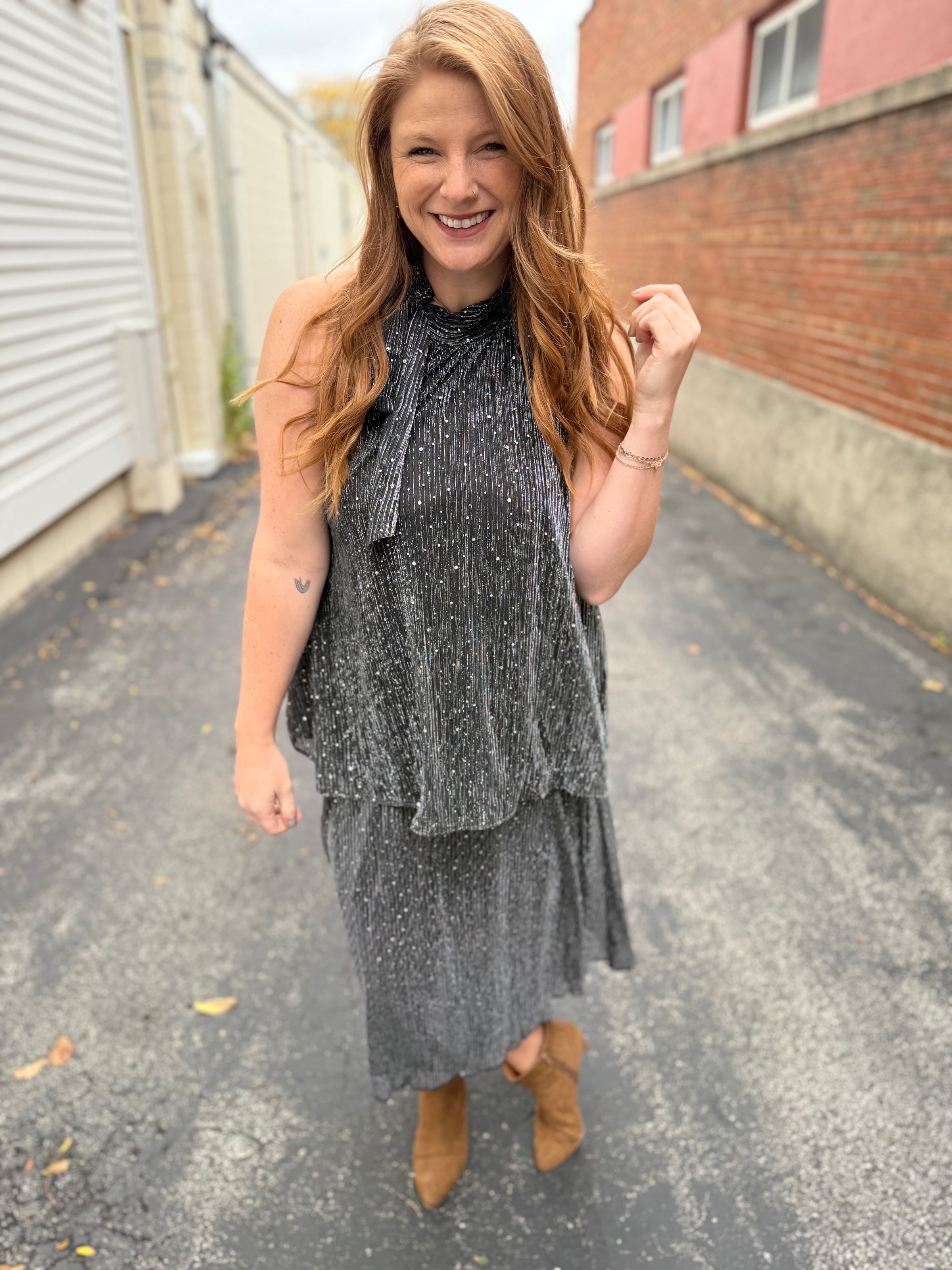 Turn heads in the Midnight Tie Halter Top, a shimmering metallic piece that adds instant sparkle to your look. Its tie detail lets you customize the fit while the halter neckline highlights your shoulders for a flirty vibe. Perfect for nights out