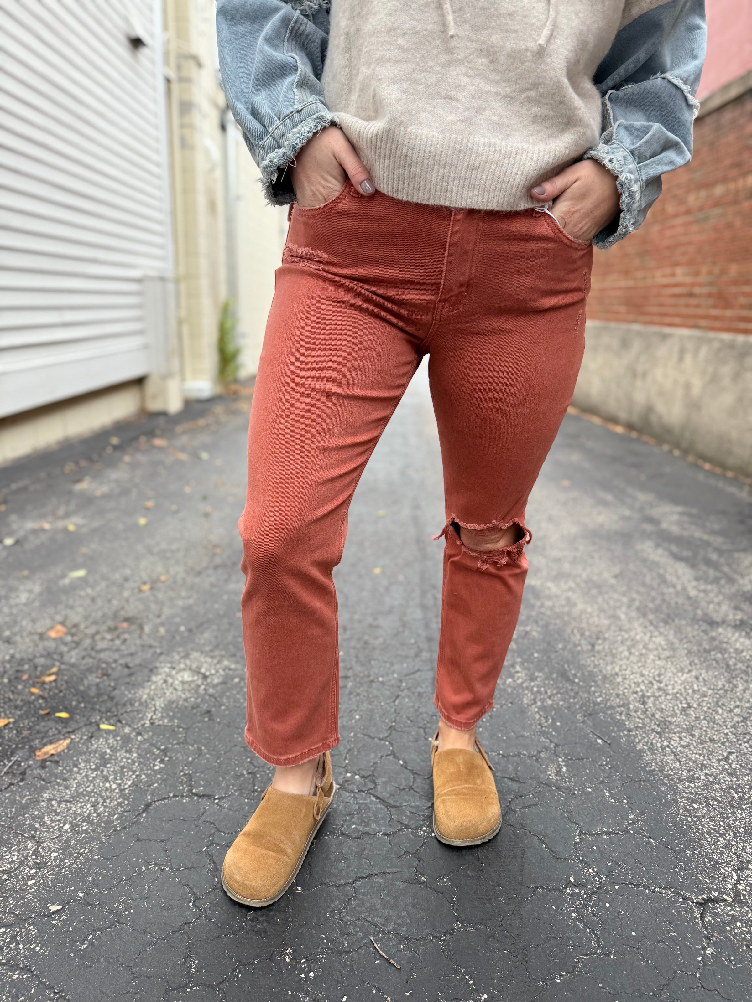 Bring playful energy to your wardrobe with these Copper Distressed High Rise Slim Fit Jeans. Featuring a vibrant orange hue and just the right amount of distressing, they add a bold, lively touch to any outfit. The high-rise design flatters your silhouette while the slim fit keeps things sleek and comfortable. Perfect for making a statement with a fun, edgy vibe.
