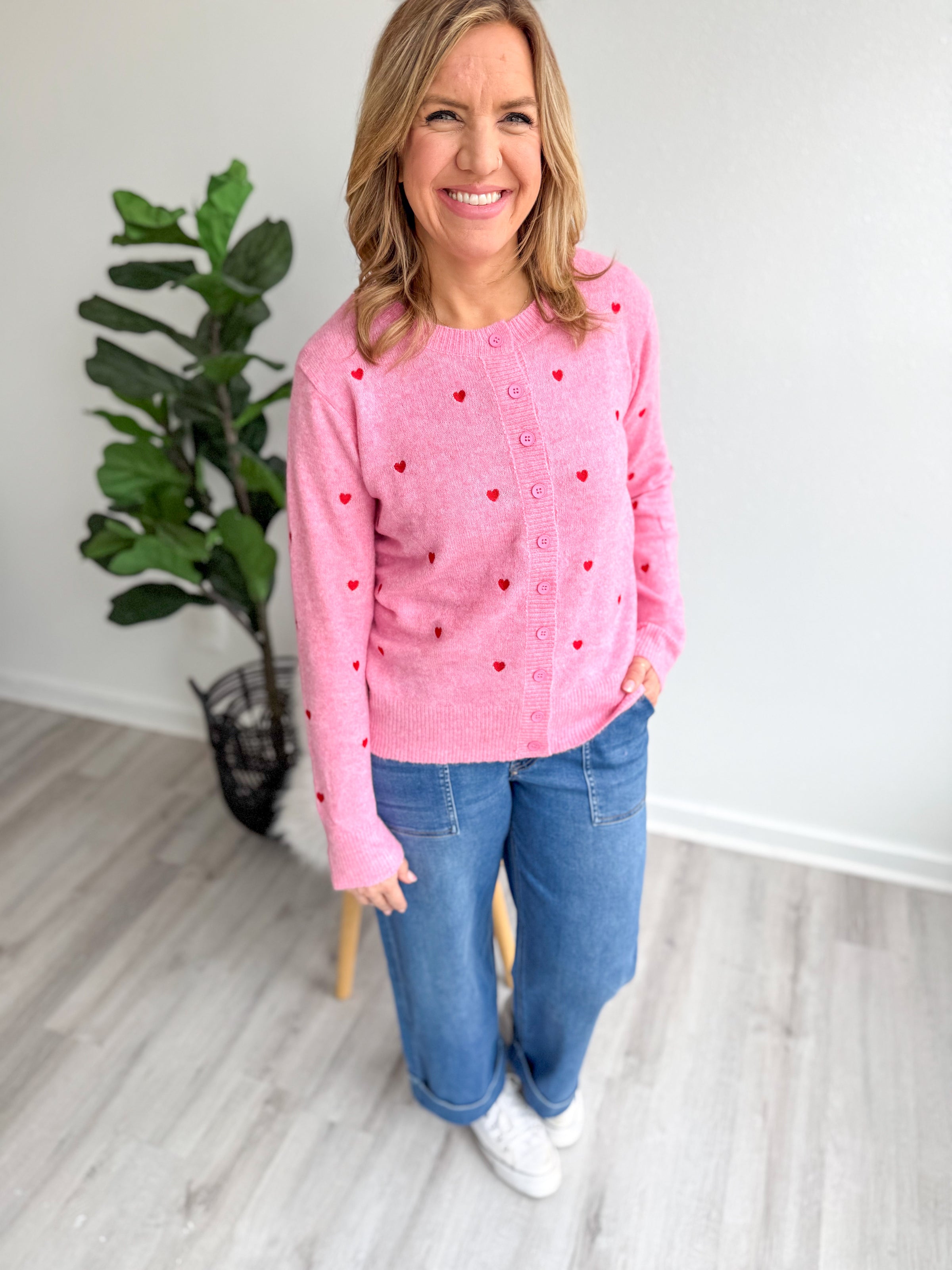 Wrap yourself in sweetness with this adorable pink button-up sweater, featuring delicate little hearts that add a charming touch to any outfit. Perfect for expressing your romantic side while staying cozy and stylish, this piece is an instant favorite for anyone who loves cute, feminine details.