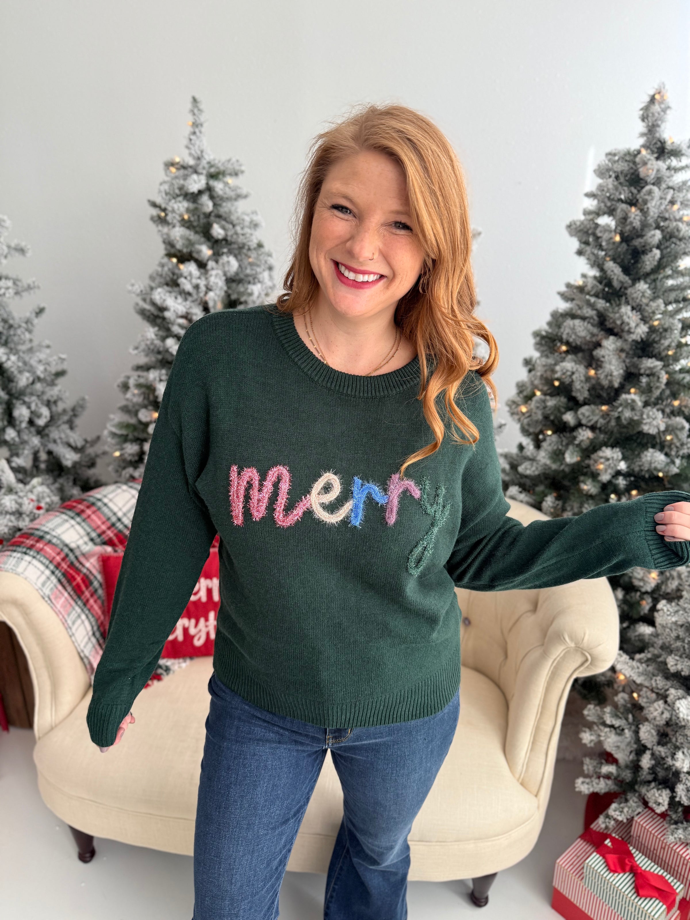Get ready to sparkle this holiday season with the Merry Tinsel Sweater in Evergreen! Its vibrant hue and festive tinsel detailing make it the perfect blend of trendy and fun. Cozy, cheerful, and sure to spread holiday cheer, this sweater brings playful spirit to every celebration. Stay stylish while jingling all the way!