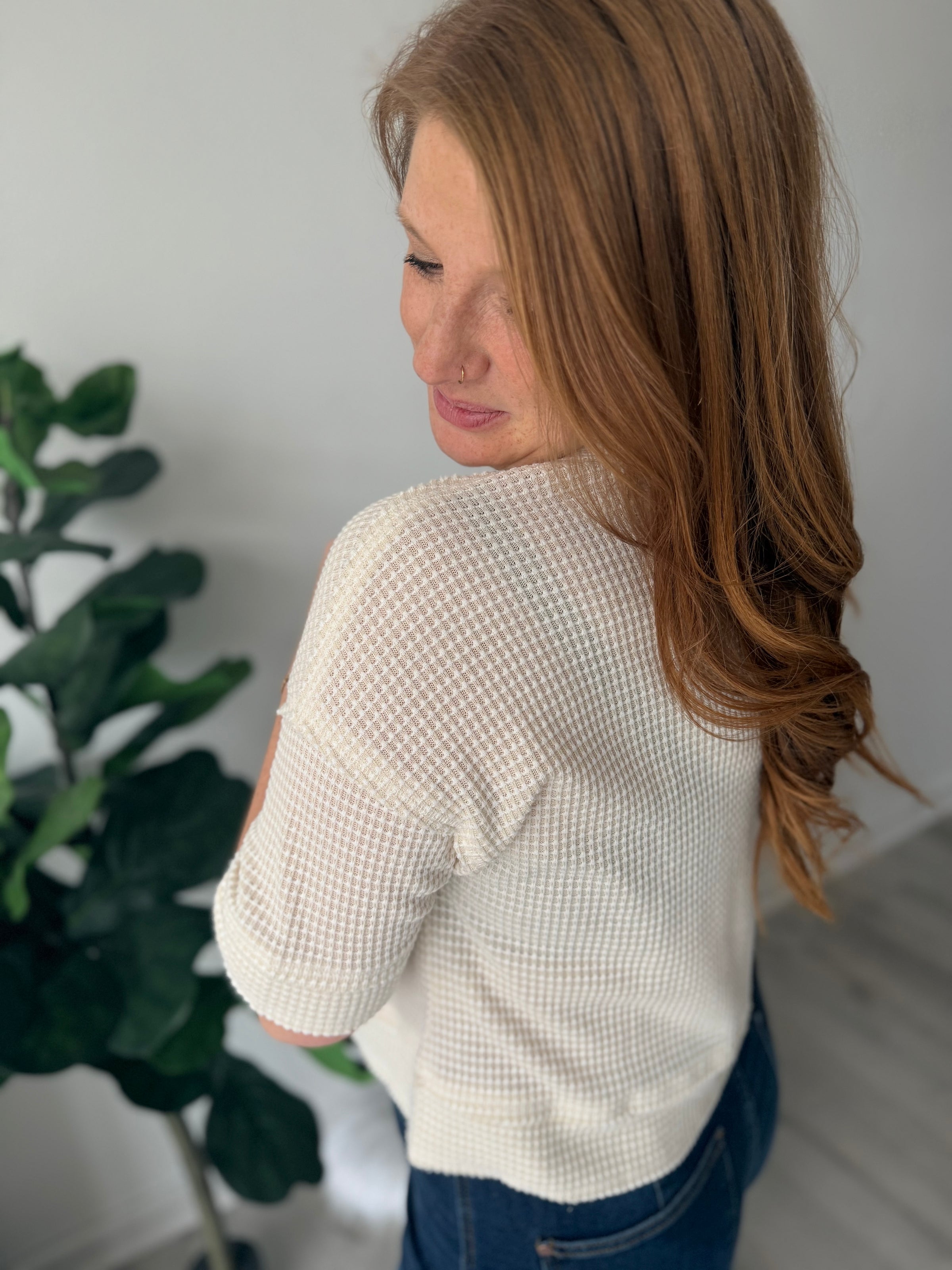 Elevate your casual wardrobe with this charming waffle button-up top! The textured waffle fabric adds visual interest and a cozy feel, while the quarter-length sleeves offer the perfect balance between coverage and breathability. Classic button-up styling makes it effortlessly versatile—dress it up with tailored pants or keep it relaxed with your favorite jeans. A wardrobe essential that works as hard as you do, with a touch of laid-back charm.