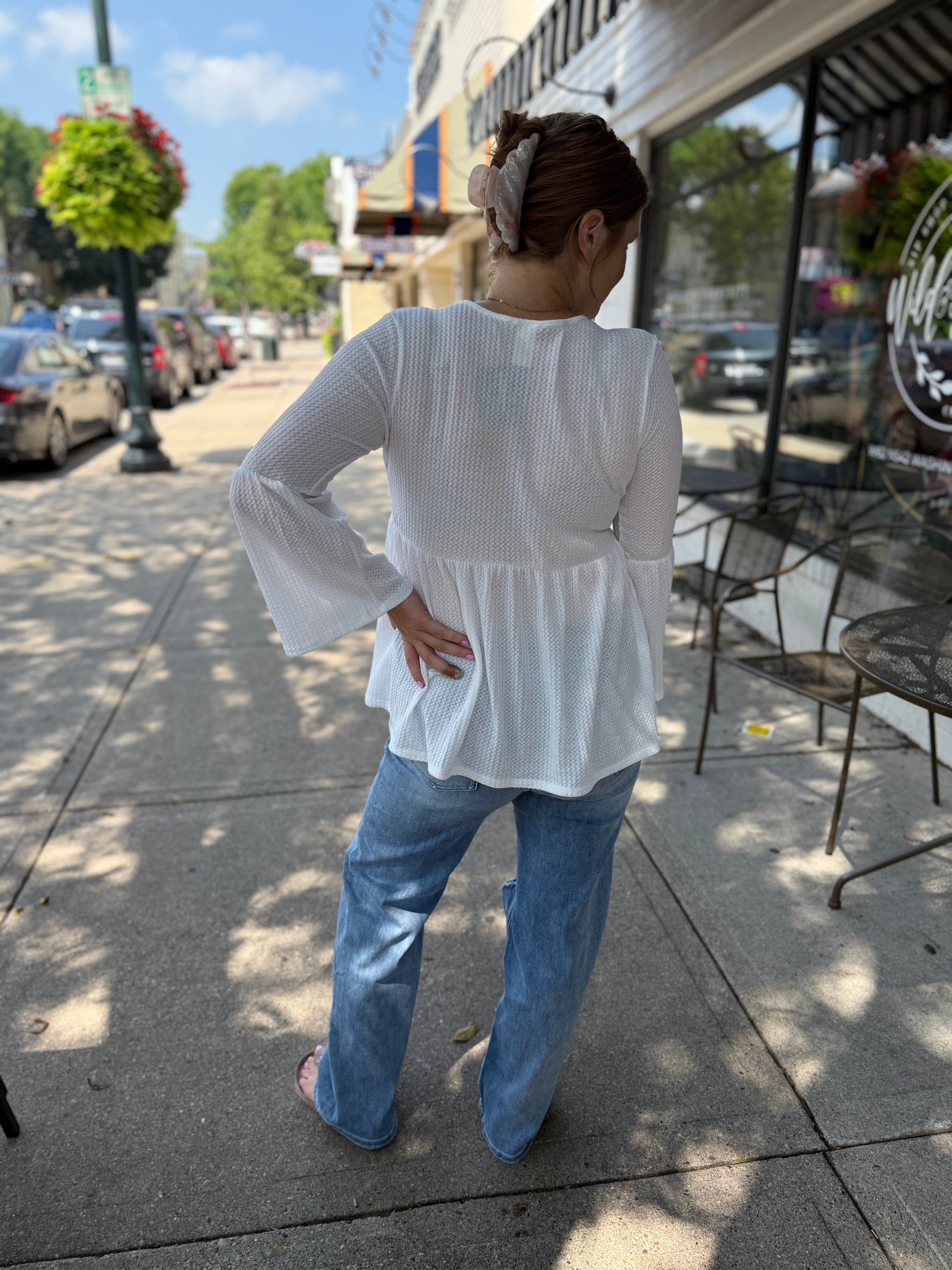 This ivory waffle knit babydoll top brings a playful charm to your casual wardrobe. Its soft texture and relaxed fit create a breezy, comfortable feel perfect for sunny days or cozy layering. The babydoll silhouette adds a flirty touch, making it an easy favorite for effortless style.