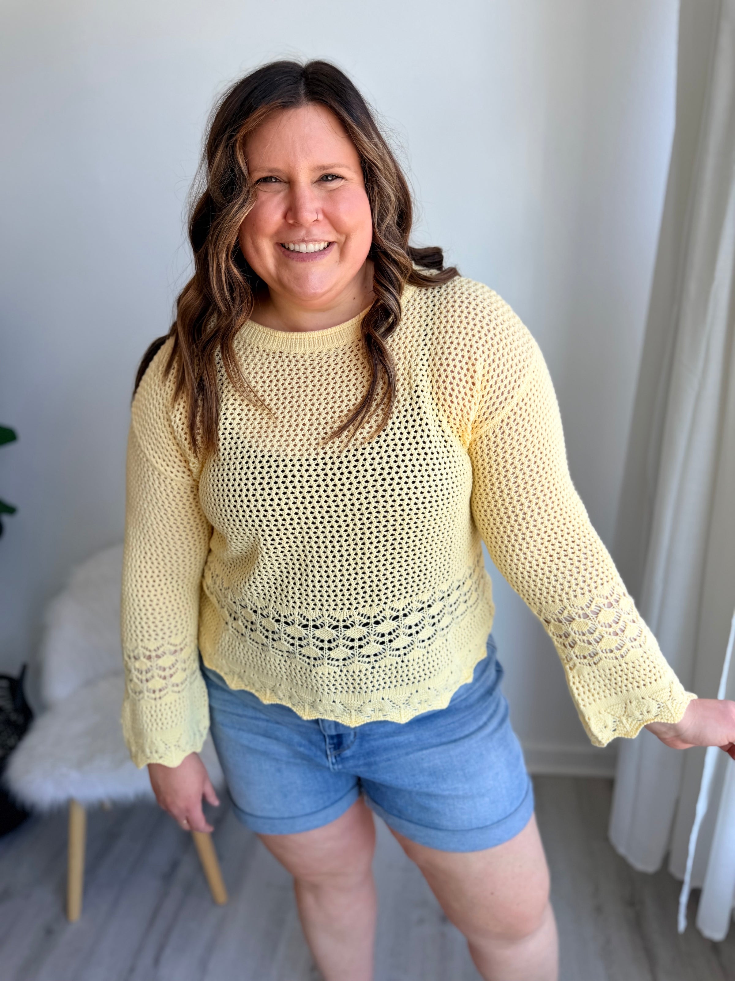 Wrap yourself in warmth and whimsy with this charming scallop knit sweater! Featuring delicate scalloped detailing that adds a touch of vintage-inspired elegance, this cozy layer brings sunshine vibes to any outfit. The soft, breathable knit fabric feels as good as it looks, making it perfect for layering through transitional seasons or wearing solo when the weather cooperates. Whether you're sipping coffee at your favorite café or enjoying a casual weekend adventure, this sweater strikes the perfect balance between comfort and style. A wardrobe essential that proves coziness never goes out of fashion.